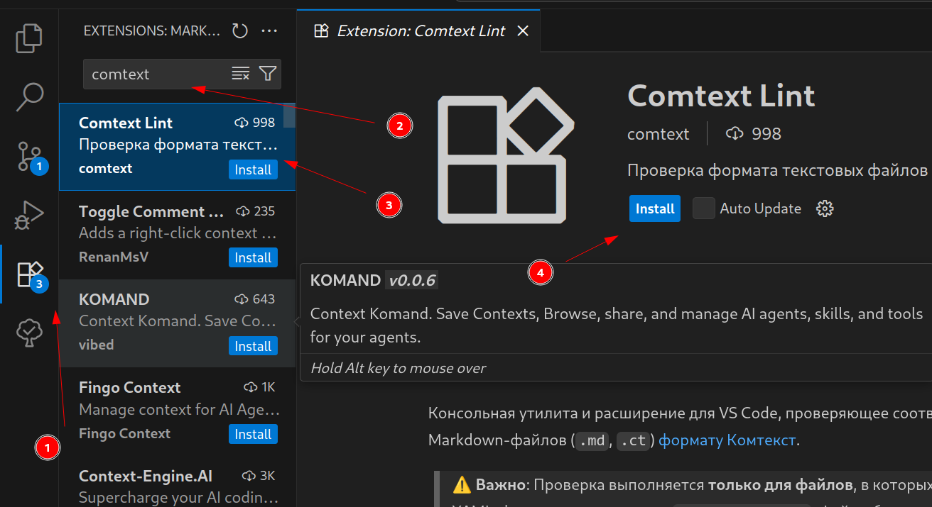 В левой панели нажмите на значок расширений (1), в поиске введите comtext (2), выберите плагин Comtext-lint (3) и нажмите Install (4).
