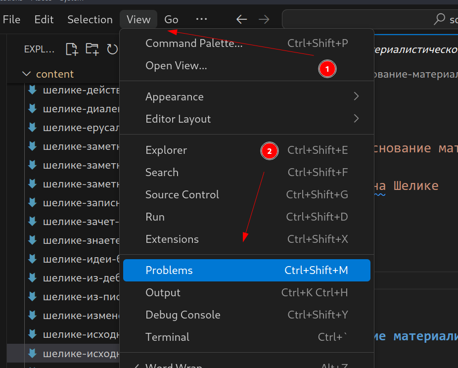 Если в файле есть ошибка, она отобразится в списке проблем (1), а файл будет подсвечен в дереве проекта (2).