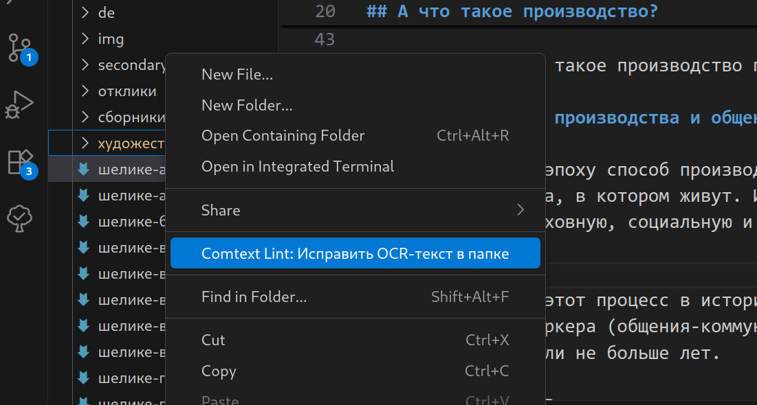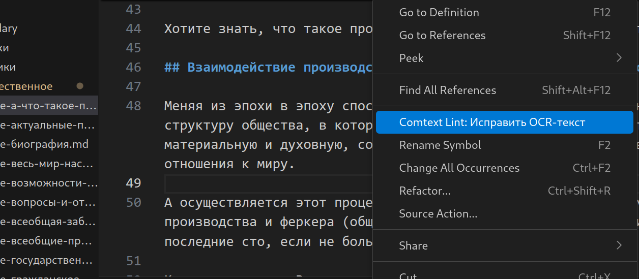 Плагин содержит функцию исправления частых ошибок после OCR. Применить её можно через контекстное меню редактора или для всего каталога.