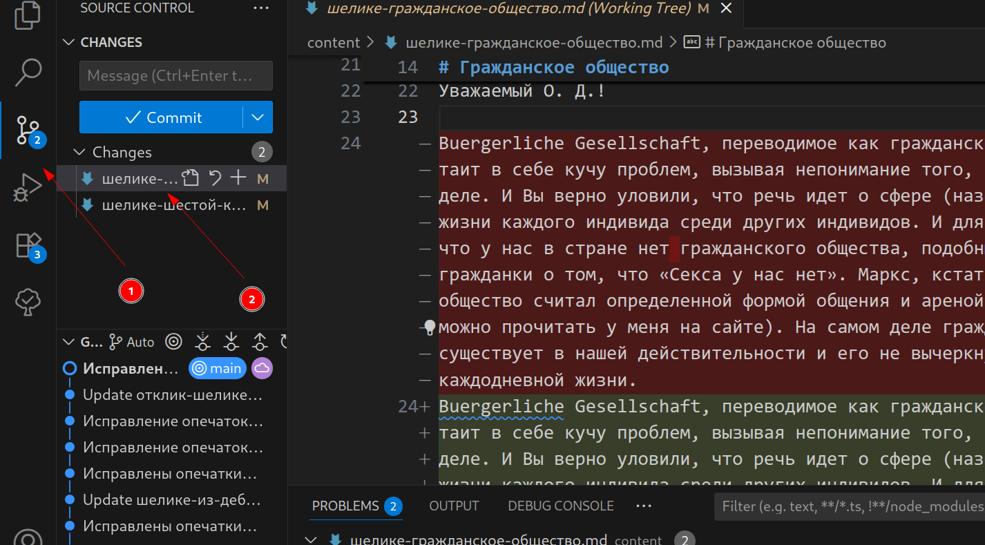 После автоматического обновления файла проверьте изменения. Если вы используете Git для хранения файлов, VSCodium покажет их в специальном окне.