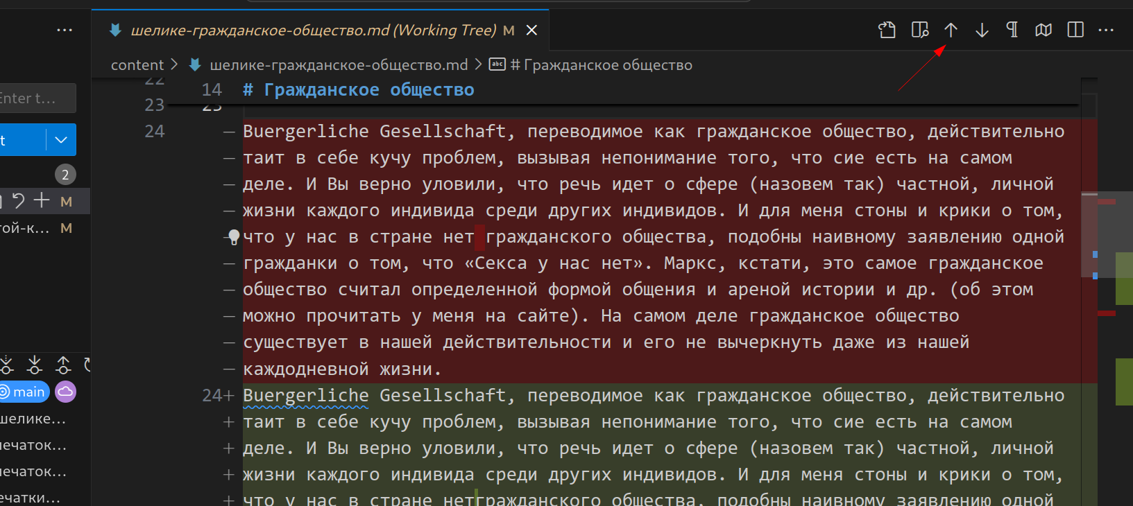 Кнопки в правой верхней панели редактора позволяют перемещаться между изменениями. Это удобно для больших файлов с несколькими правками.