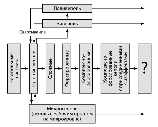 Схема (см. рис. 12) дает более или менее целостное, но слишком общее представление о путях развития технических систем. Пользоваться этой схемой для решения задач неудобно: даже в детализированном виде схема не отражает многих механизмов развития, например приемов свертывания. Практически удобнее иметь — по крайней мере для решения типовых задач — свод конкретных правил, расположенных в определенной последовательности. Такой свод появился в ТРИЗ в 1975 г. Создан он был не только с использованием общих законов развития, но и на основе анализа больших массивов патентной информации: изучены десятки тысяч патентов и авторских свидетельств, прослежена логика развития многих технических систем.