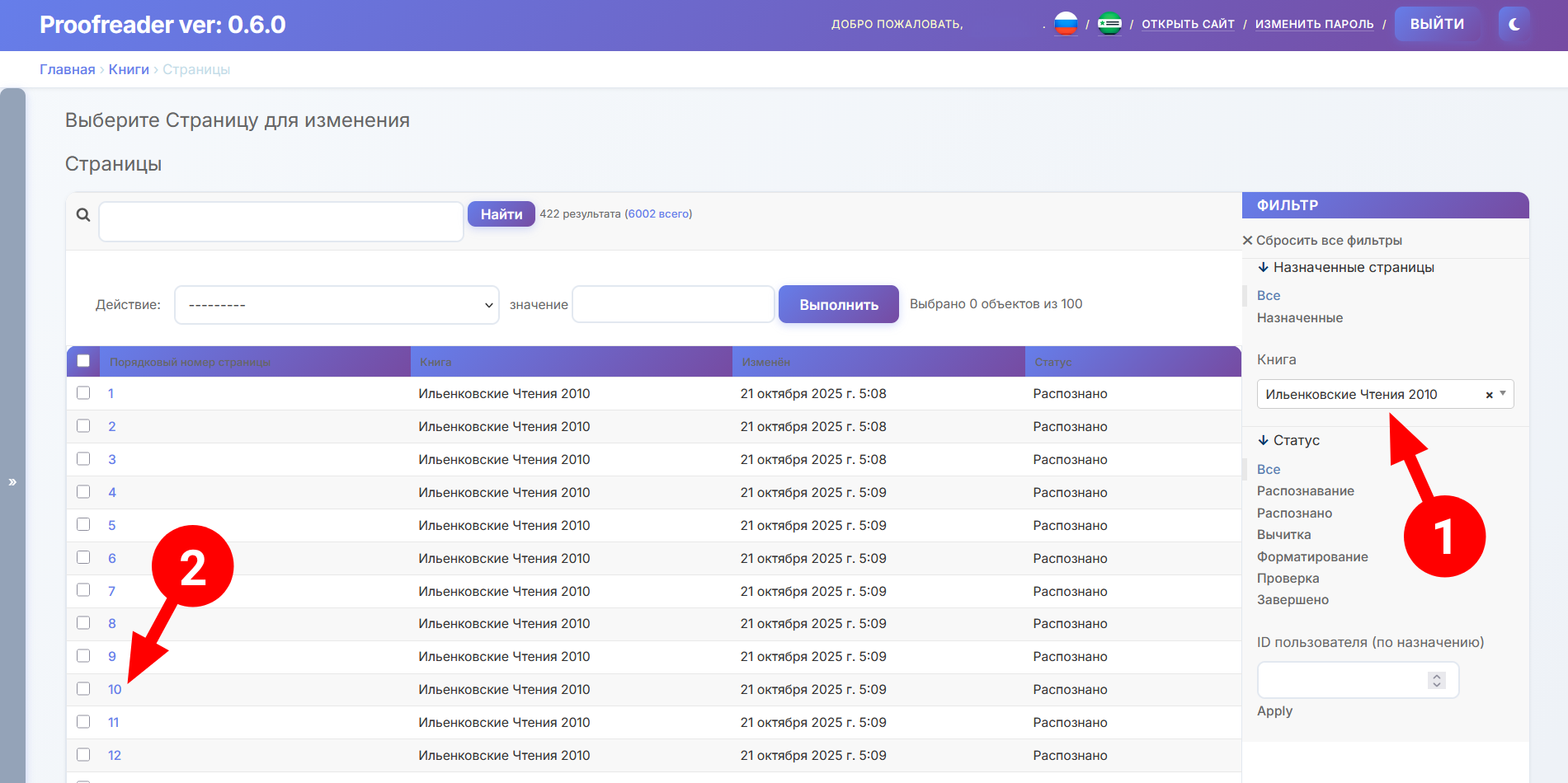 В правом меню выберите нужную книгу (1), после этого в таблице, в центре экрана, останутся только страницы выбранной книги. Затем выберите нужную страницу (2).
