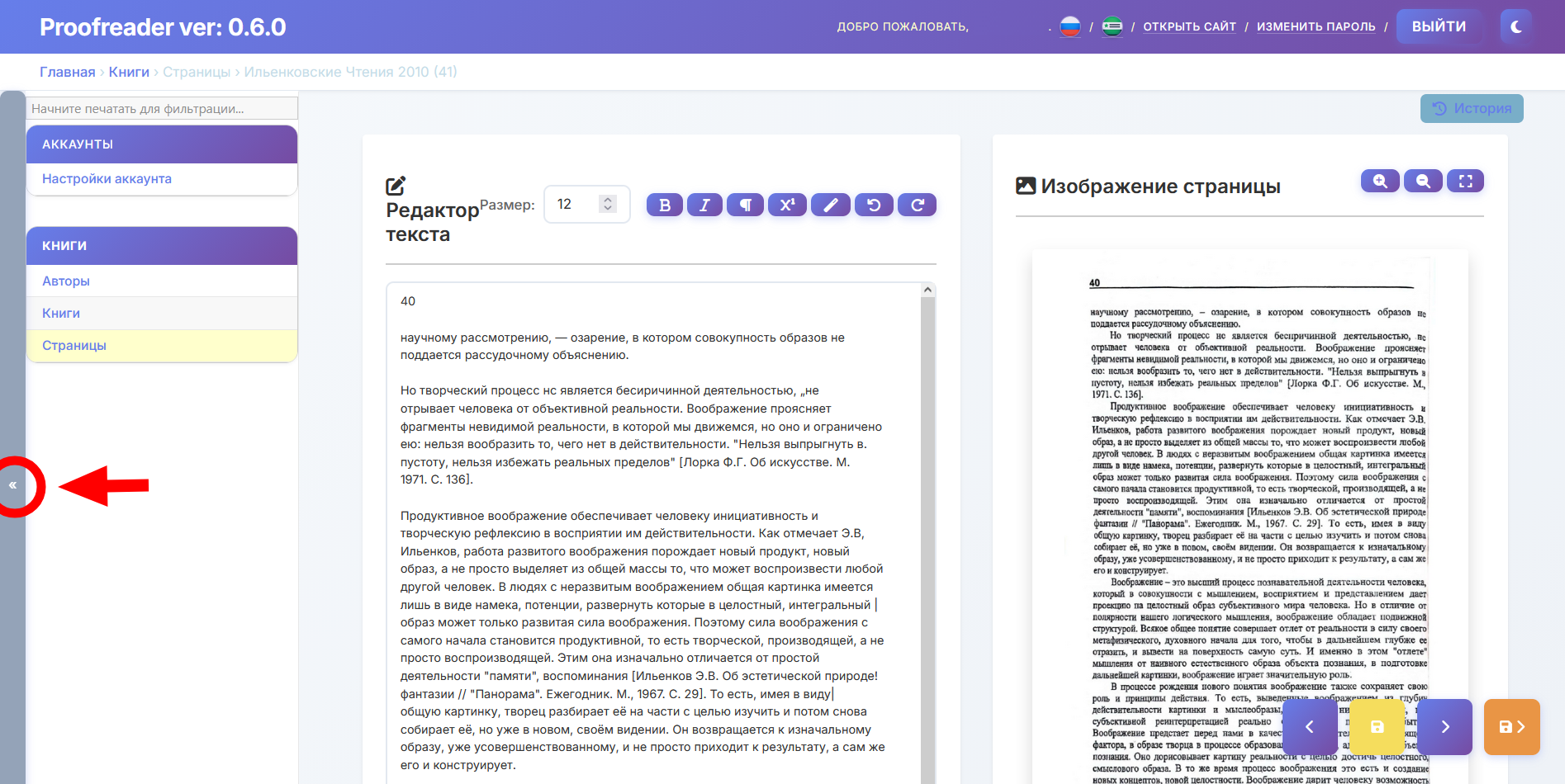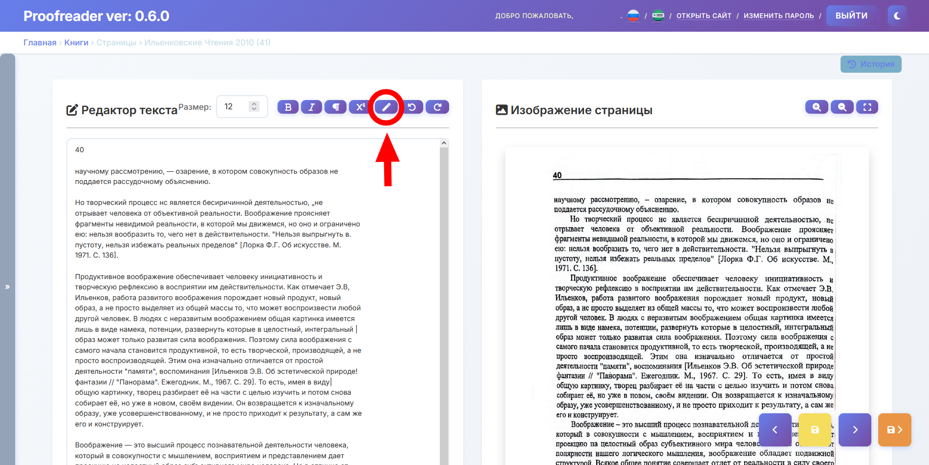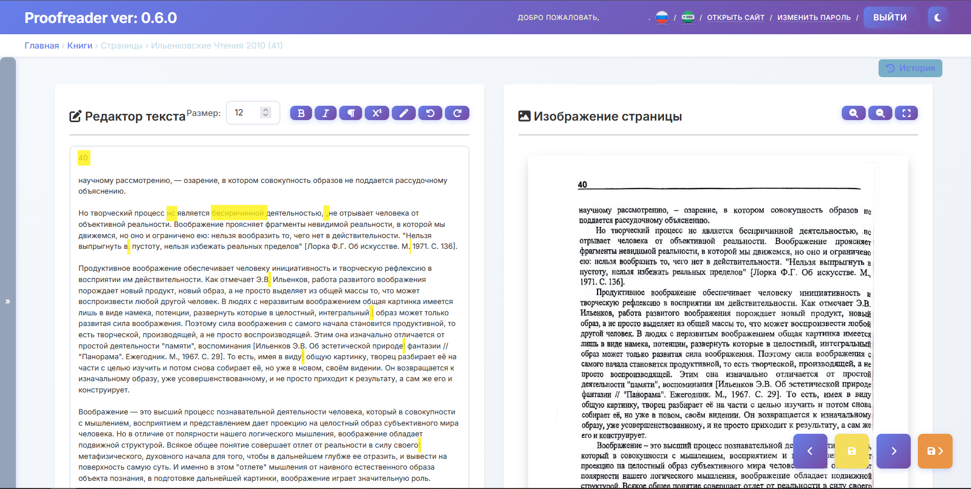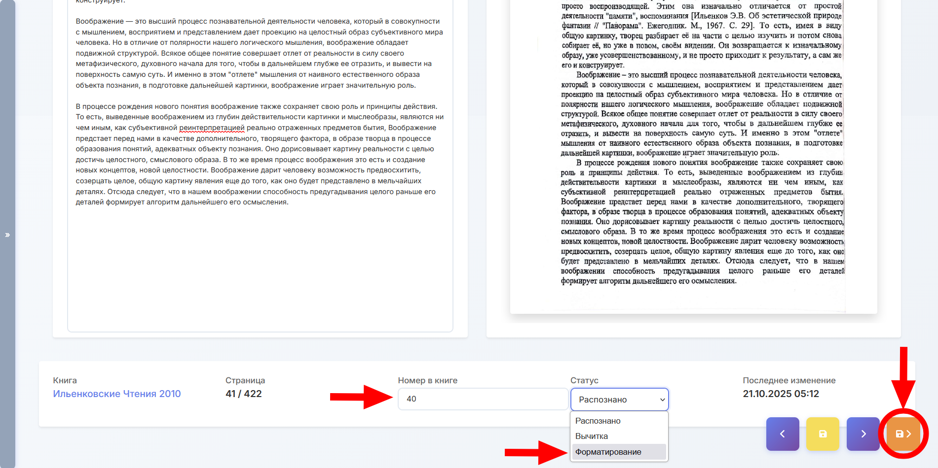 Если в тексте книги присутствует номер страницы — удалите его. Исправьте опечатки, сверяясь с изображением страницы.