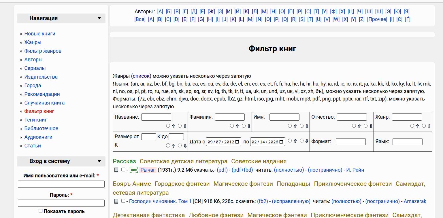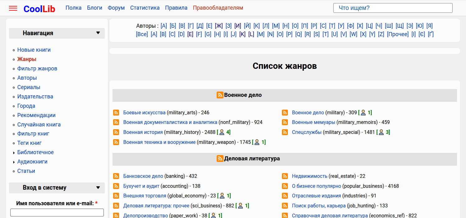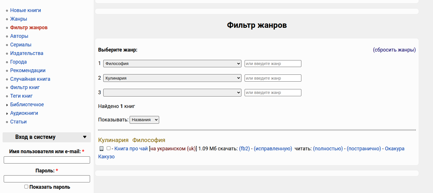 Список жанров доступен для скачивания. У одной книги может быть указано несколько жанров. Для поиска с фильтром по нескольким жанрам предусмотрена отдельная страница: