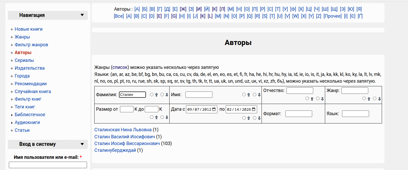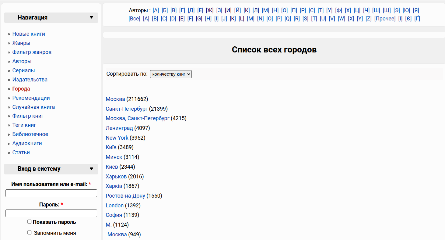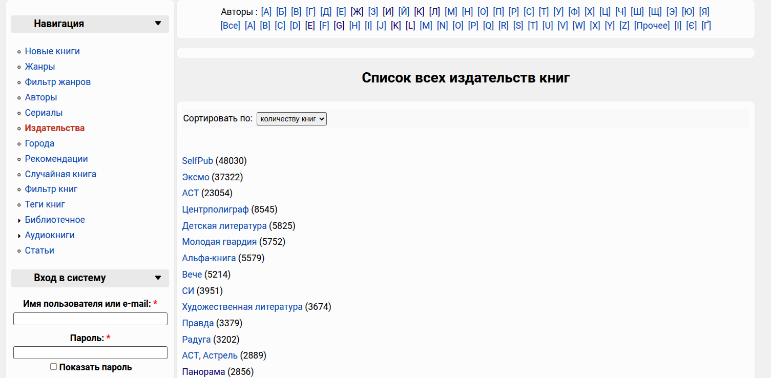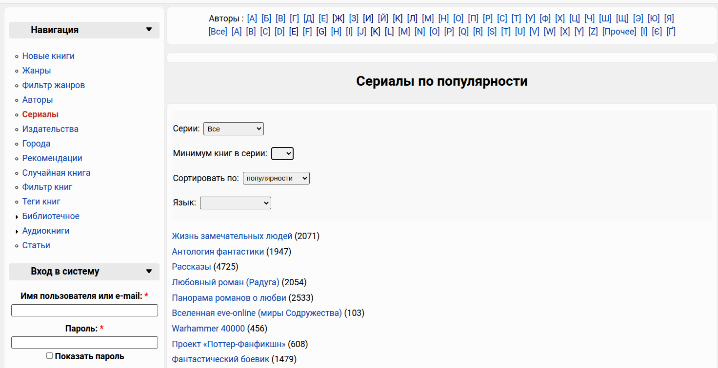 В библиотеке реализованы каталоги по авторам, жанрам, сериям и издательствам.