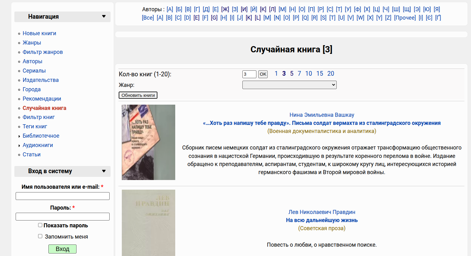 Страница с отображением нескольких случайных книг: