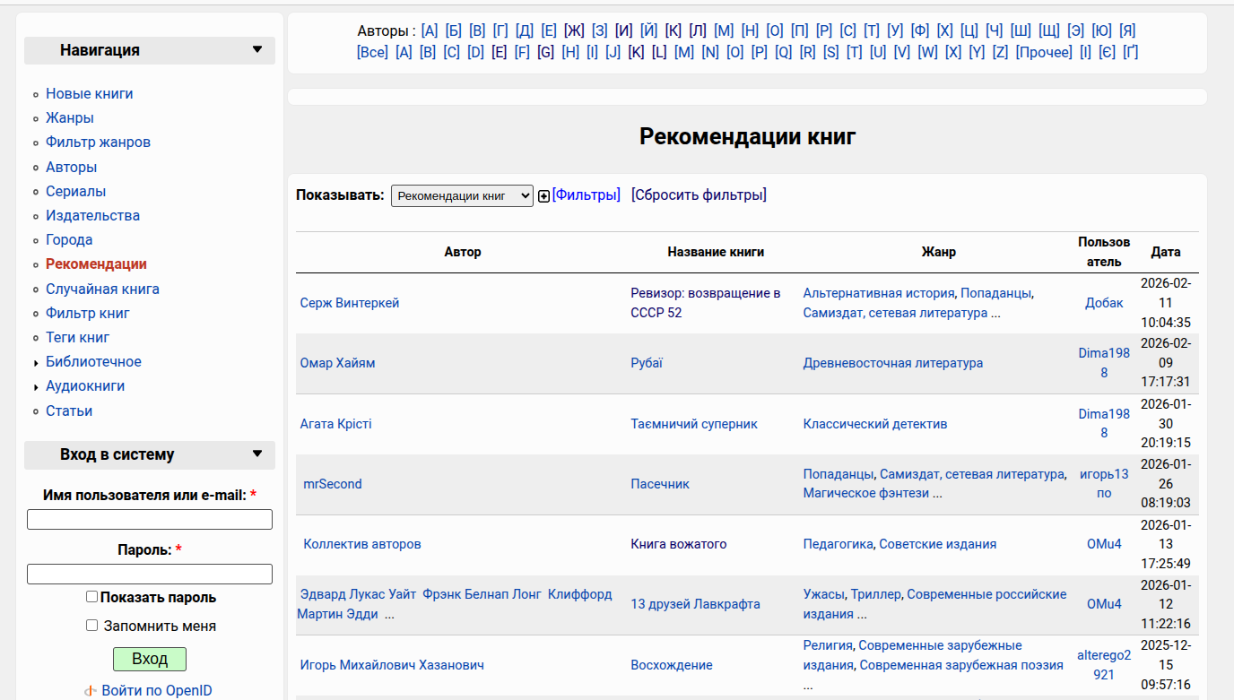 Для книг реализована система рекомендаций. Общий список книг с рекомендациями: