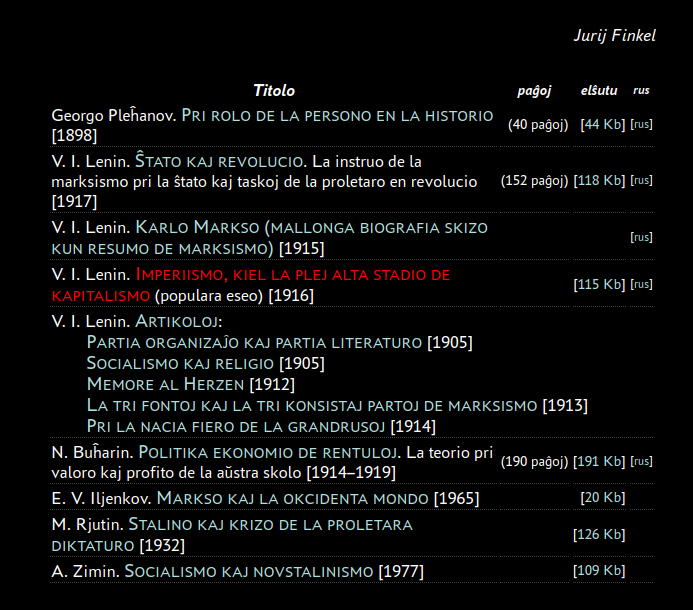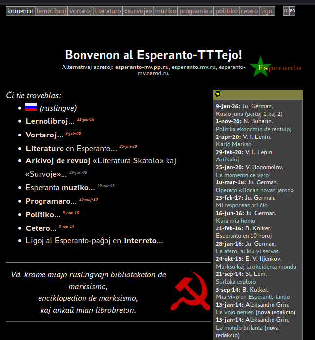 Сайт esperanto.mv.ru делится на несколько разделов: литературу на эсперанто, библиотечку марксизма и энциклопедию марксизма. Создатель сайта — Юрий Финкель.