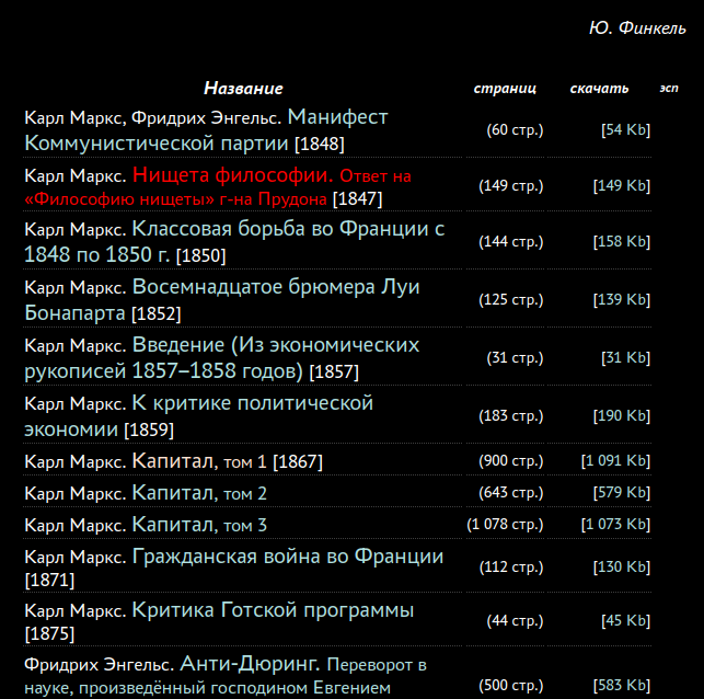 Здесь я публикую произведения классиков марксизма, взятые из разных источников (в интернете и не только, в частности, здесь), которые 1) я прочёл сам, 2) считаю важными для изучения марксизма, 3) тексты которых я оформил так, чтобы они были удобны как для чтения с экрана, так и для распечатывания на бумаге.