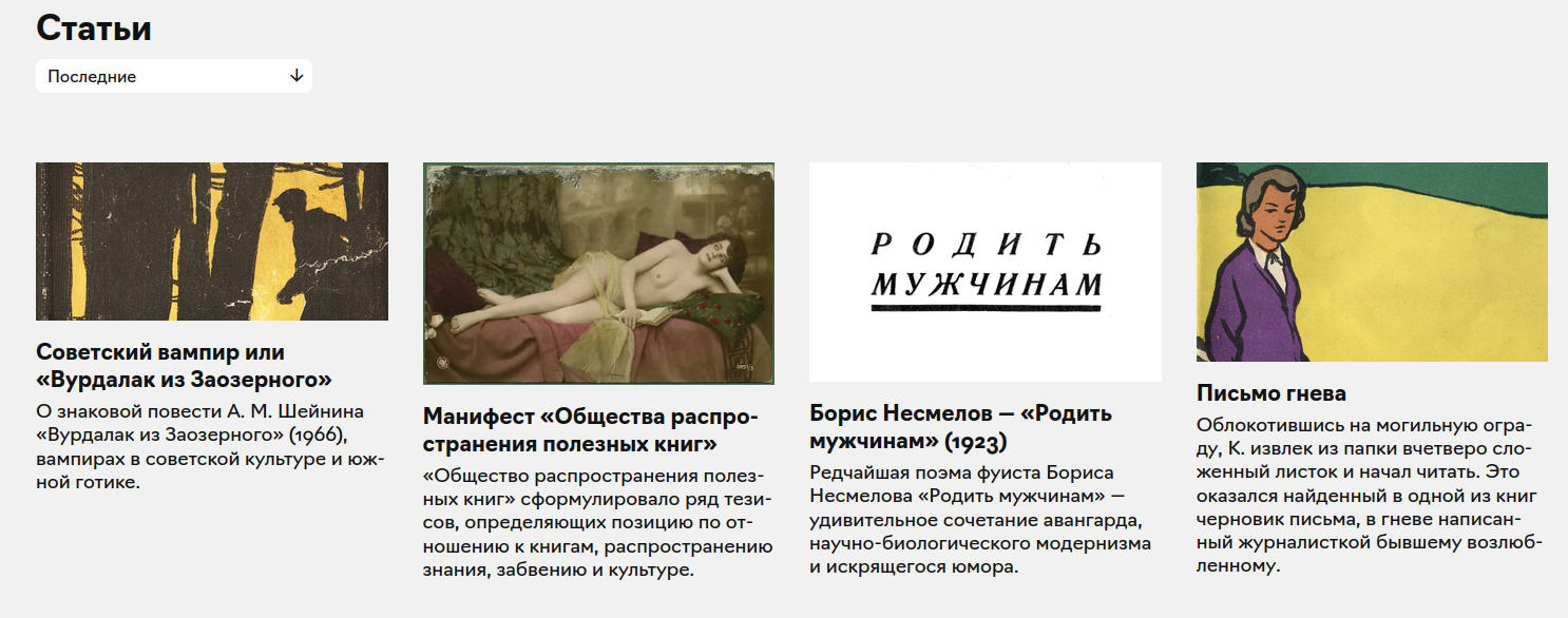На сайте опубликовано небольшое количество статей. Часть из них посвящена самому сайту: подборки материалов, отчёты о встречах участников. Другая часть — статьи на темы литературы и искусства.