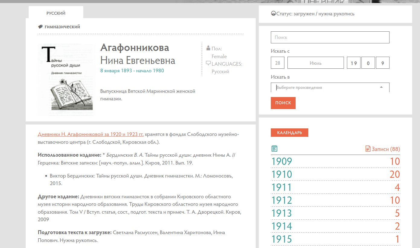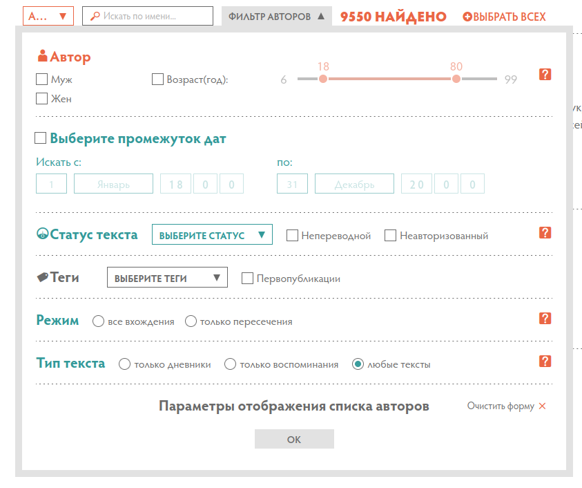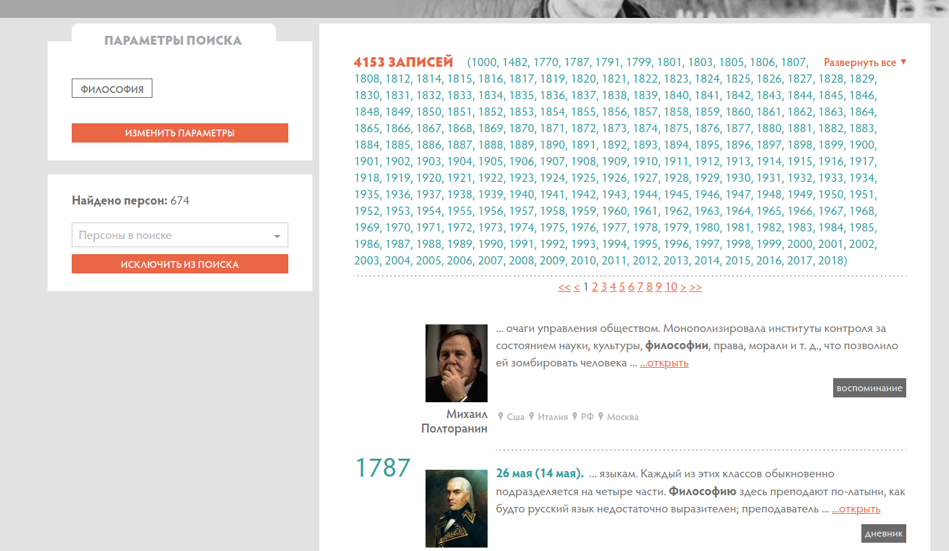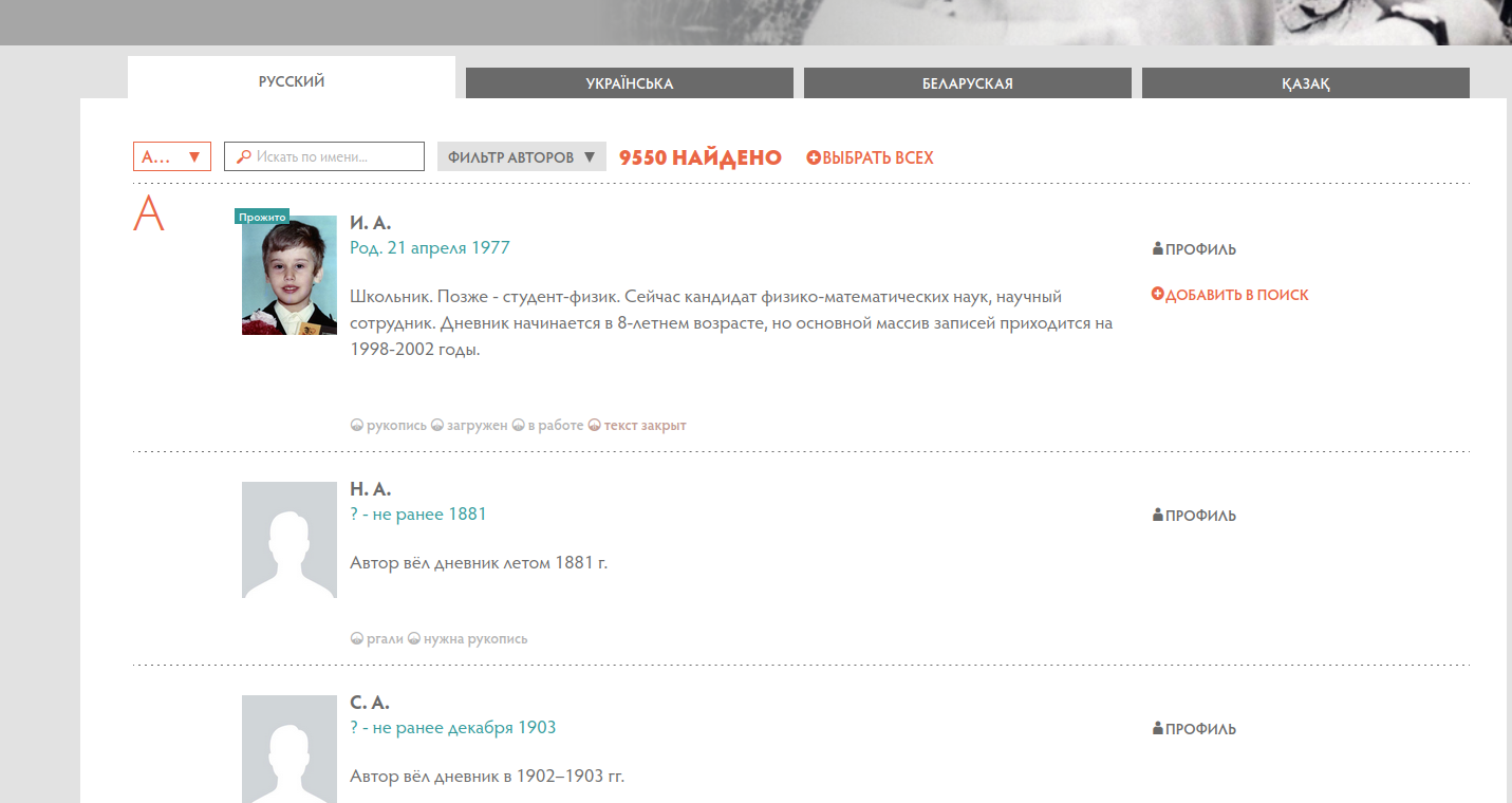 Возможен поиск по тексту дневников с учётом морфологии. В результатах поиска можно применить фильтр по автору.