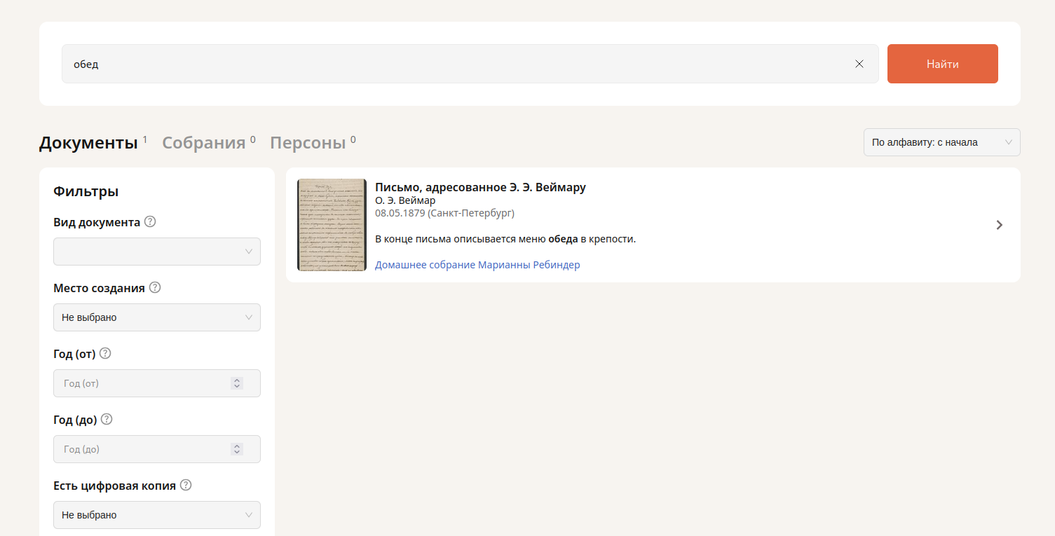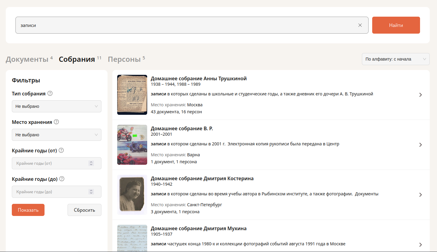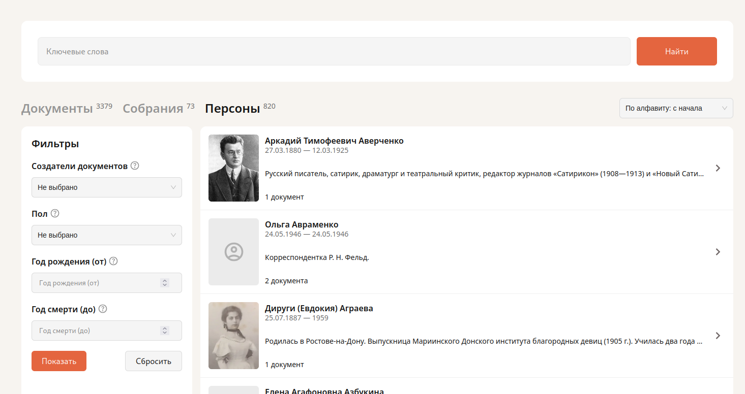 Архив представлен в трёх срезах: документы, собрания, персоны.