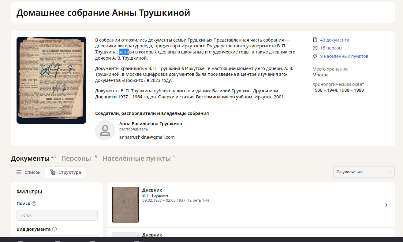 Для пользователей этой системы мы разрабатываем унифицированные правила описания, оцифровки, расшифровки и разметки документов из частных и государственных собраний. Благодаря этому мы не просто создаем коллекцию исторически значимых документов: унифицированное машиночитаемое описание документов и текстовый слой с семантической разметкой превратят наше собрание в большие данные для компьютерного анализа в парадигме Natural Language Processing, который многое поможет понять об общественных настроениях описываемых исторических периодов, а также о природе разных жанров документирования себя и эпохи.