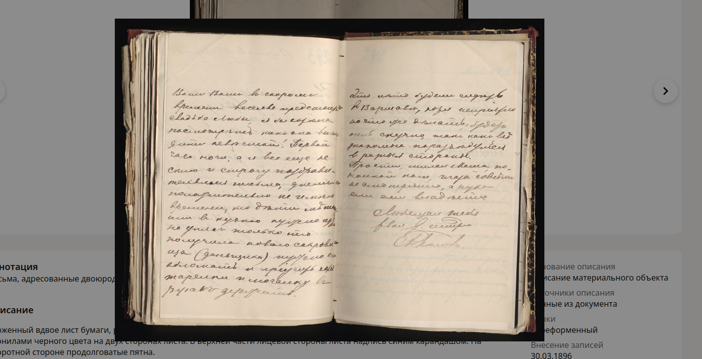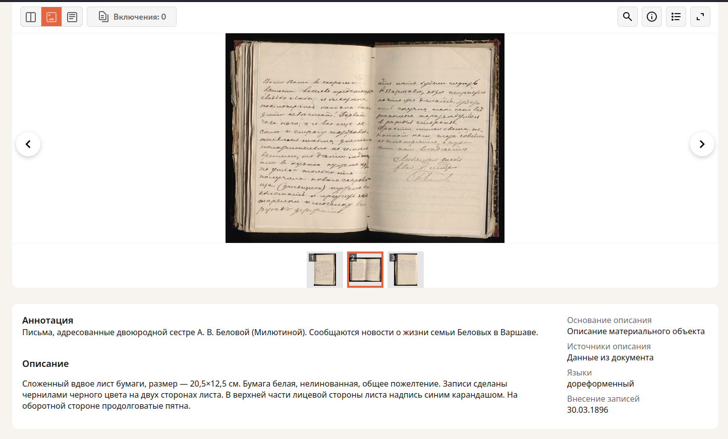 Основная часть документа — скан. Также в каждом документе есть аннотация и описание. Аннотация концентрируется на содержании, а описание включает характеристики бумаги и другие особенности материала.