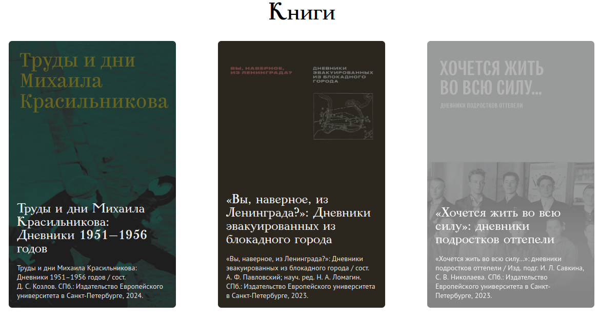 На сайте размещены ссылки на несколько книг, созданных на основе дневниковых материалов. Некоторые книги можно купить в печатном виде, есть ссылки на Яндекс.Диск для скачивания отдельных изданий, но на момент проверки ссылки не работают.